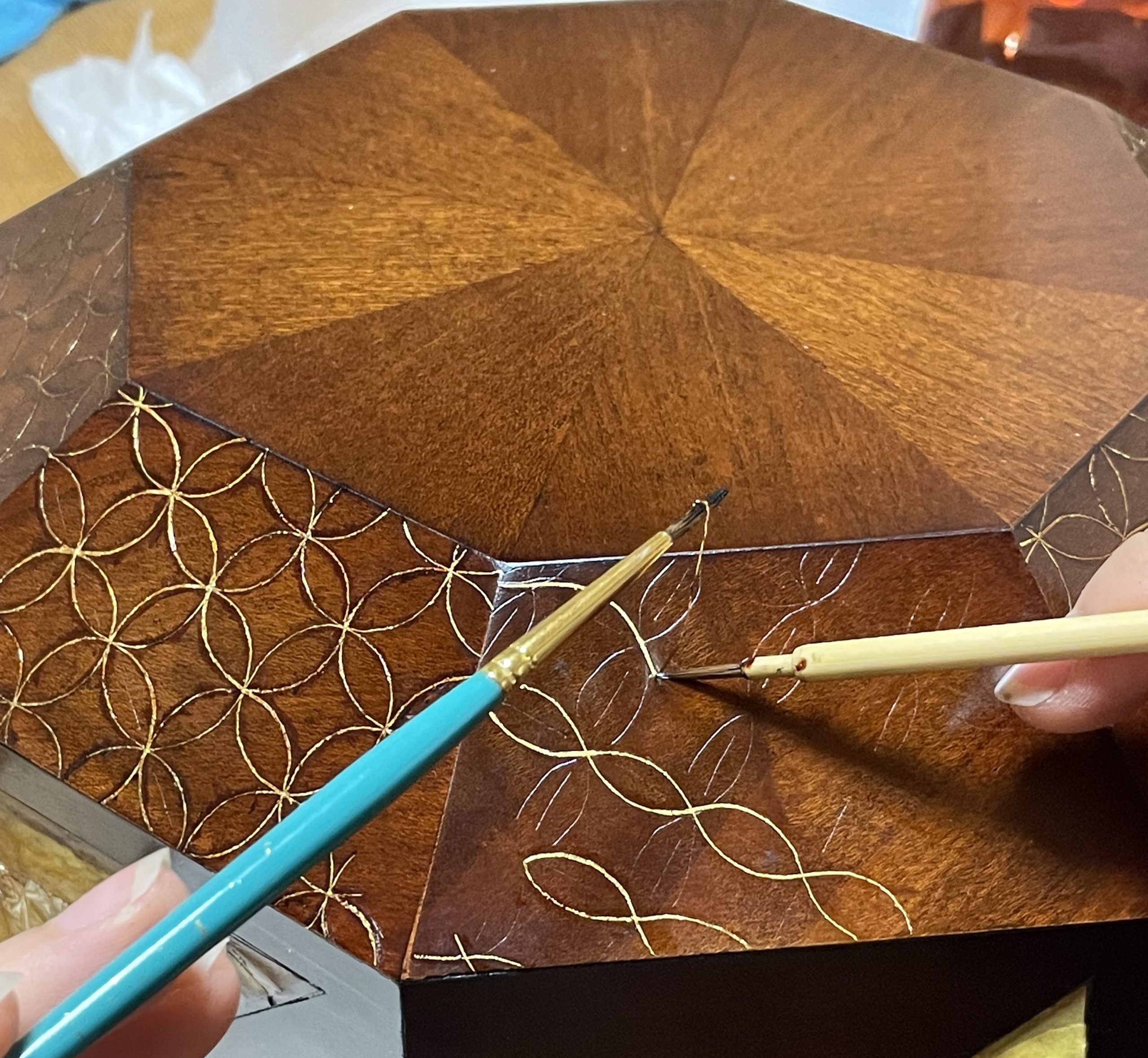 宇野萌花さん(以下、宇野)学部在籍時は、主に漆の伝統技法に着目しながら制作を続けてきました。漆芸の技法でも特に、拭き漆や白檀塗りなど漆の透けからくる独特の赤色や光沢ある色合いに惹かれています。また、墨流しや截金(きりかね)細工など、現在はあまり見られない技法に魅力を感じます。これまではまず技法があり、そこに自分の表現をすり合わせながら、抽象的な幾何図形を用いてきました。今回の「散歩道」では、有機的なモチーフに挑戦しています。
