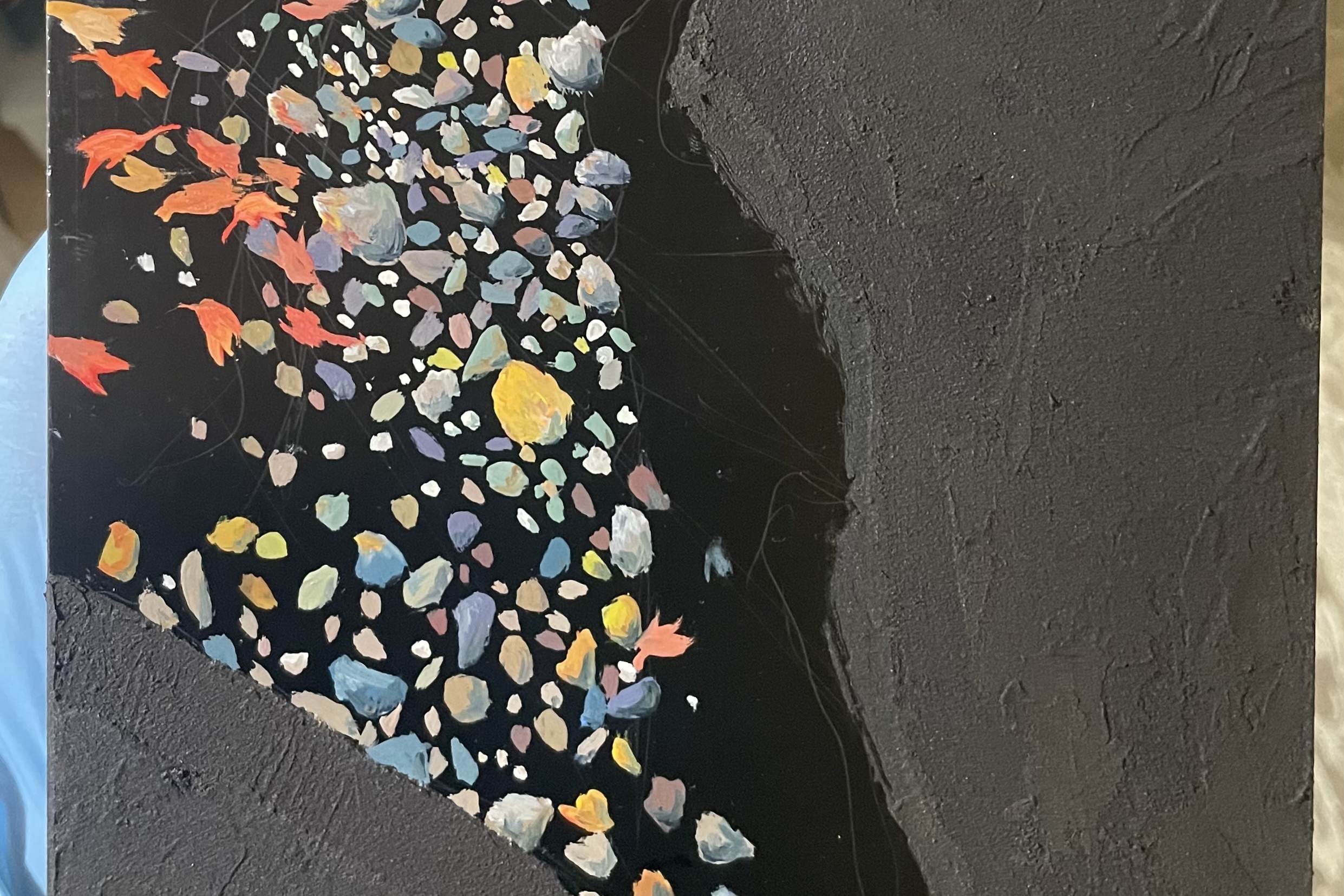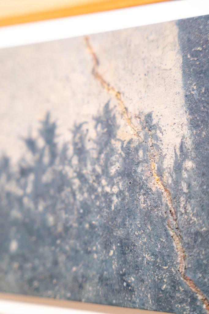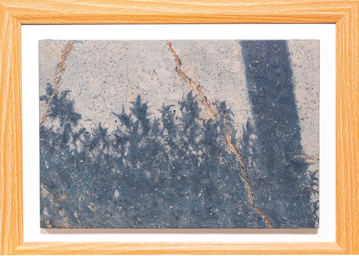 「足元に落ちる影」ではアスファルトのひび割れやデコボコしたニュアンスを漆でリアルに再現した