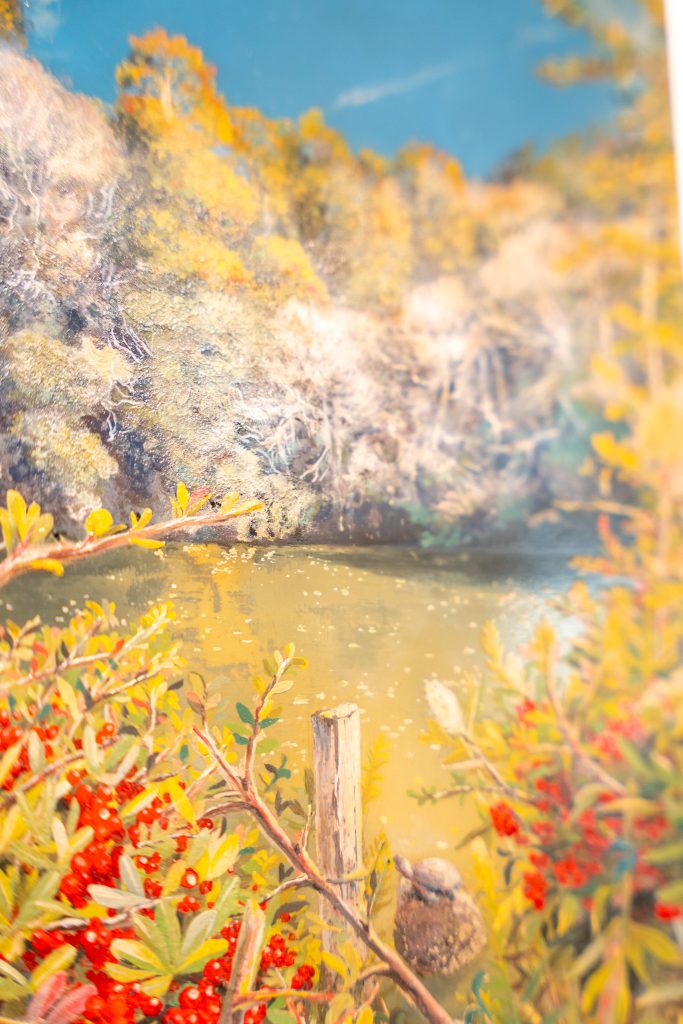 作品右下「緑の公園」は小学生のころの遠足で行った思い出の公園。自然の風景のディテールを漆の多彩な伝統技法のテクスチャーを用いて再現した