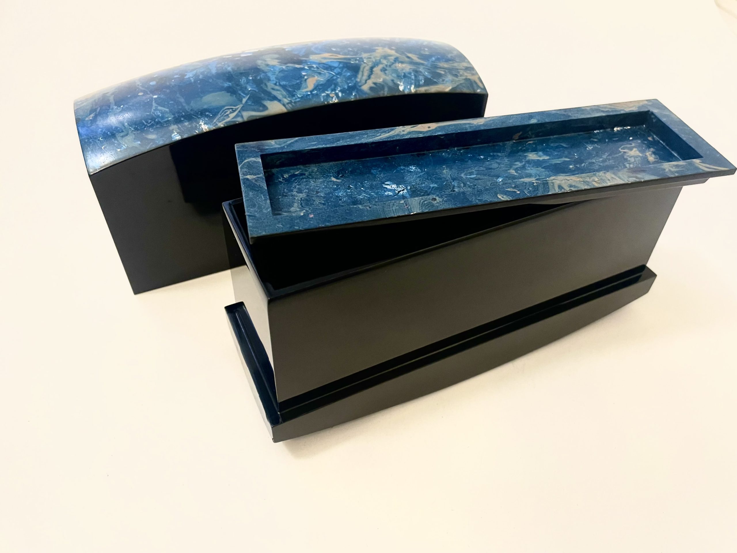 宇野萌花「Flow」/水をモチーフに墨流しで加飾した箱物作品。墨流しは、西洋のマーブリングと同様に、水に垂らした漆を転写させる技法。何重にも色漆や箔の層を重ねて、穏やかな水の流れと激しい水の流れが絡まるさまを表現した(写真=本人提供)