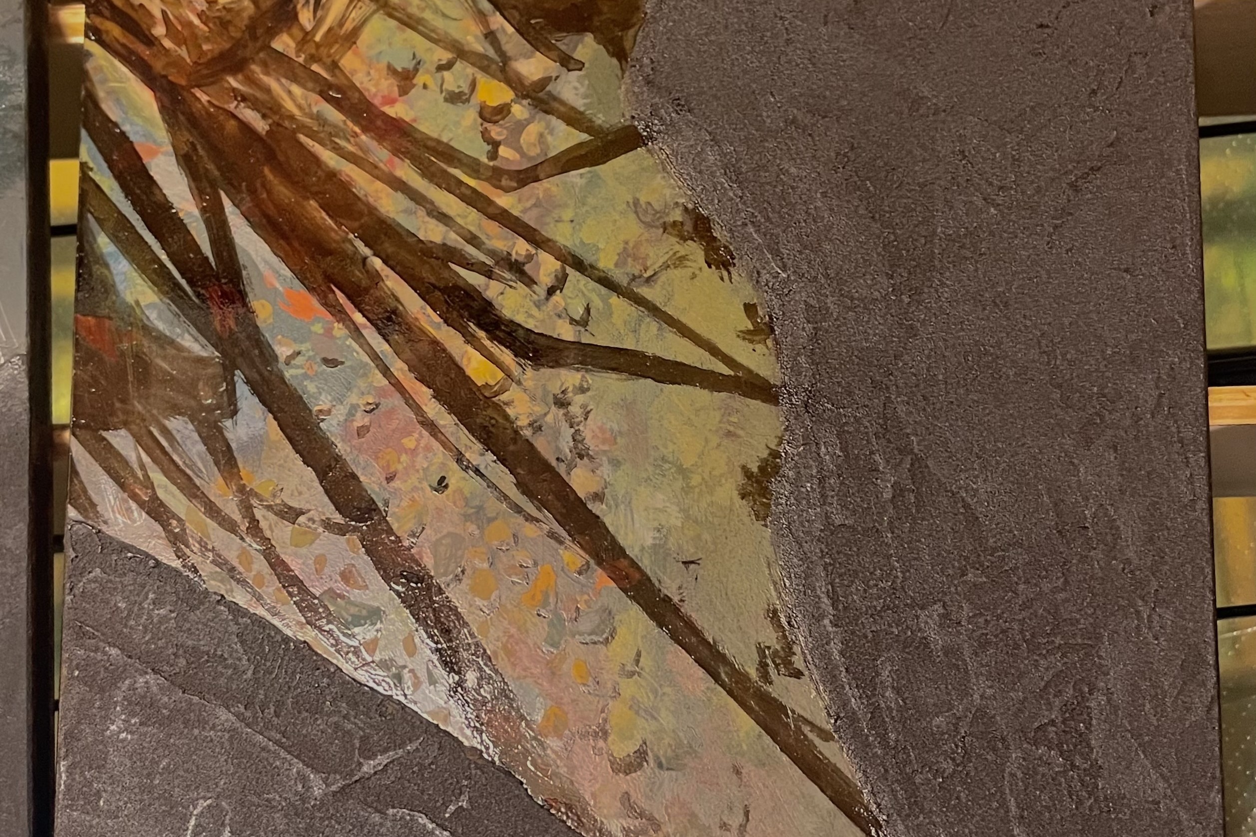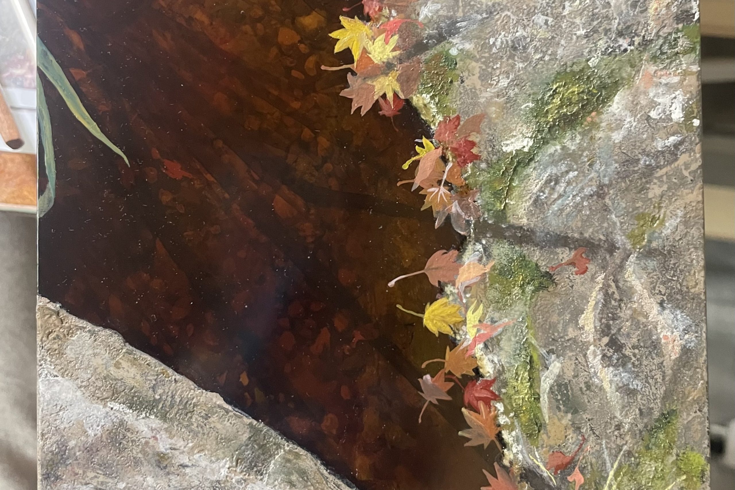 一方、左上の「川底の石」の水の部分は透漆(すきうるし)で、漆本来の色をそのまま生かしたものです。顔料や鉄粉などを混ぜる前の漆は、透き通った茶色い色をしています。中塗りに色漆を重ねて草の影を透漆で描き、その上から透漆を薄くかけ、最後に下の層が出ないように研いで磨きます。そうすることで艶がぐっと引き出され、層が奥から立ち上がってくるんです。